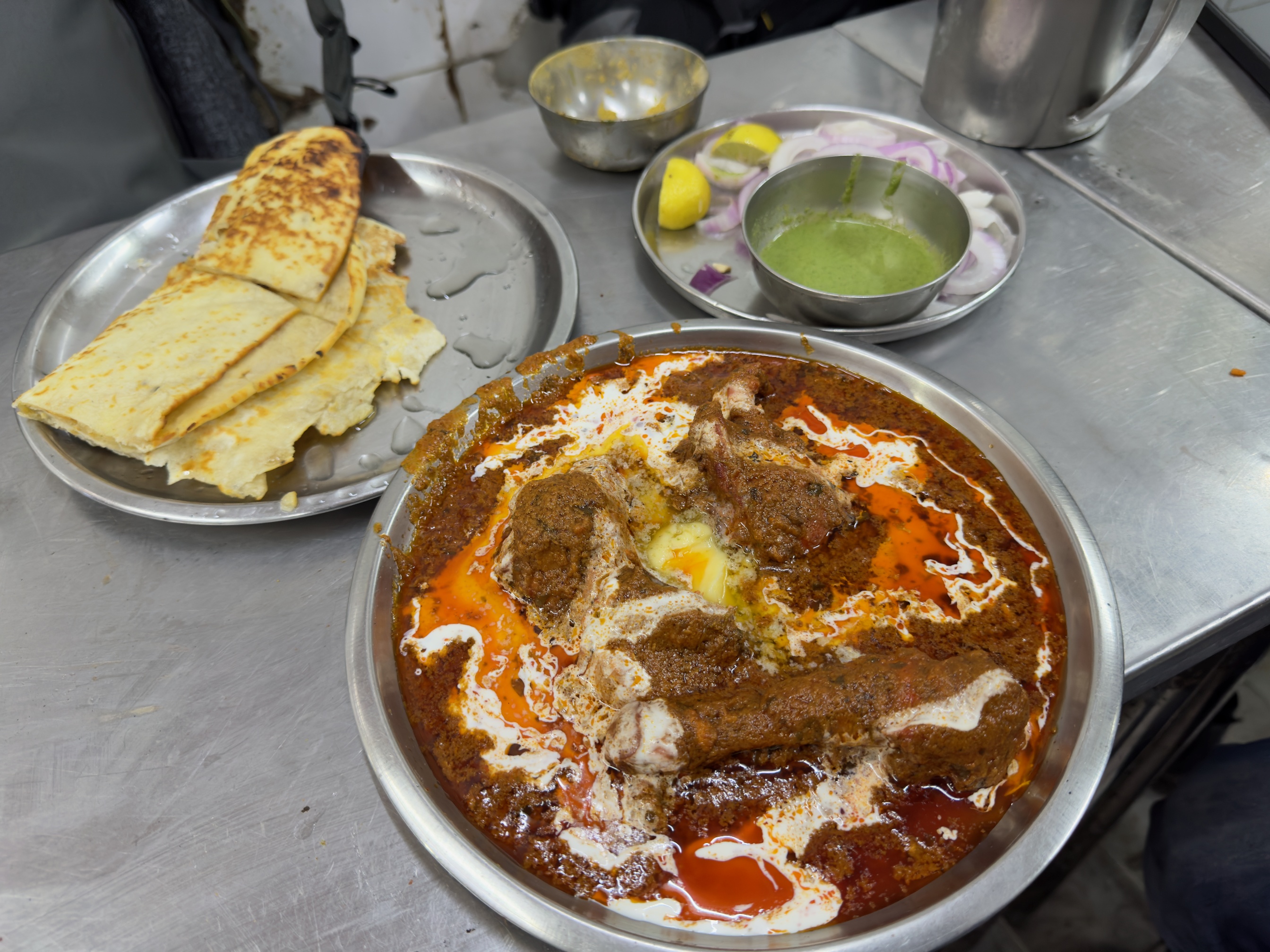 因為從齋浦爾出發的火車延誤兩小時,到焦特布爾已經是晚上8點半了,根據之前其他人的遊記,這裡會賣好吃的雞肉料理,就找了火車站附近評價不錯的雞肉料理專賣店(Al-Haq Laziz),想說不抱什麼期待,結果一吃驚為天人,是我目前吃過口味覺得不錯的奶油雞(butter chicken),而且價格也很便宜,份量也很多,一張奶油饢餅(butter naan)只要25盧比,四分之一份的奶油雞也只要205盧比,在店裡也認識從印度南方邦旅遊的兩位小哥,而他們因為不會焦特布爾當地的語言,所以跟我一樣只能用英文和店家溝通,他們很熱情的向我介紹自己家鄉的景色,也推薦我有機會也可以去南印度旅遊,吃完我們就互相道別,繼續往旅館的方向移動。