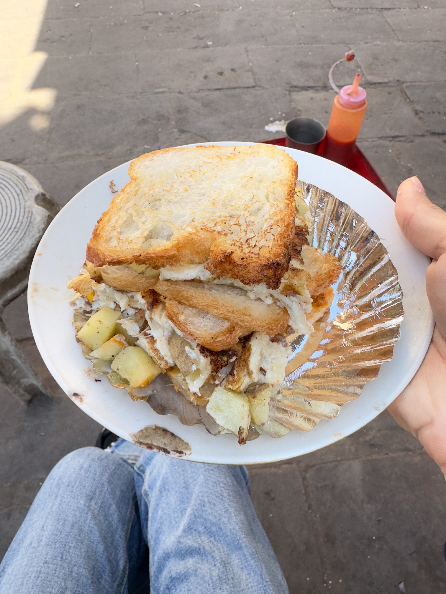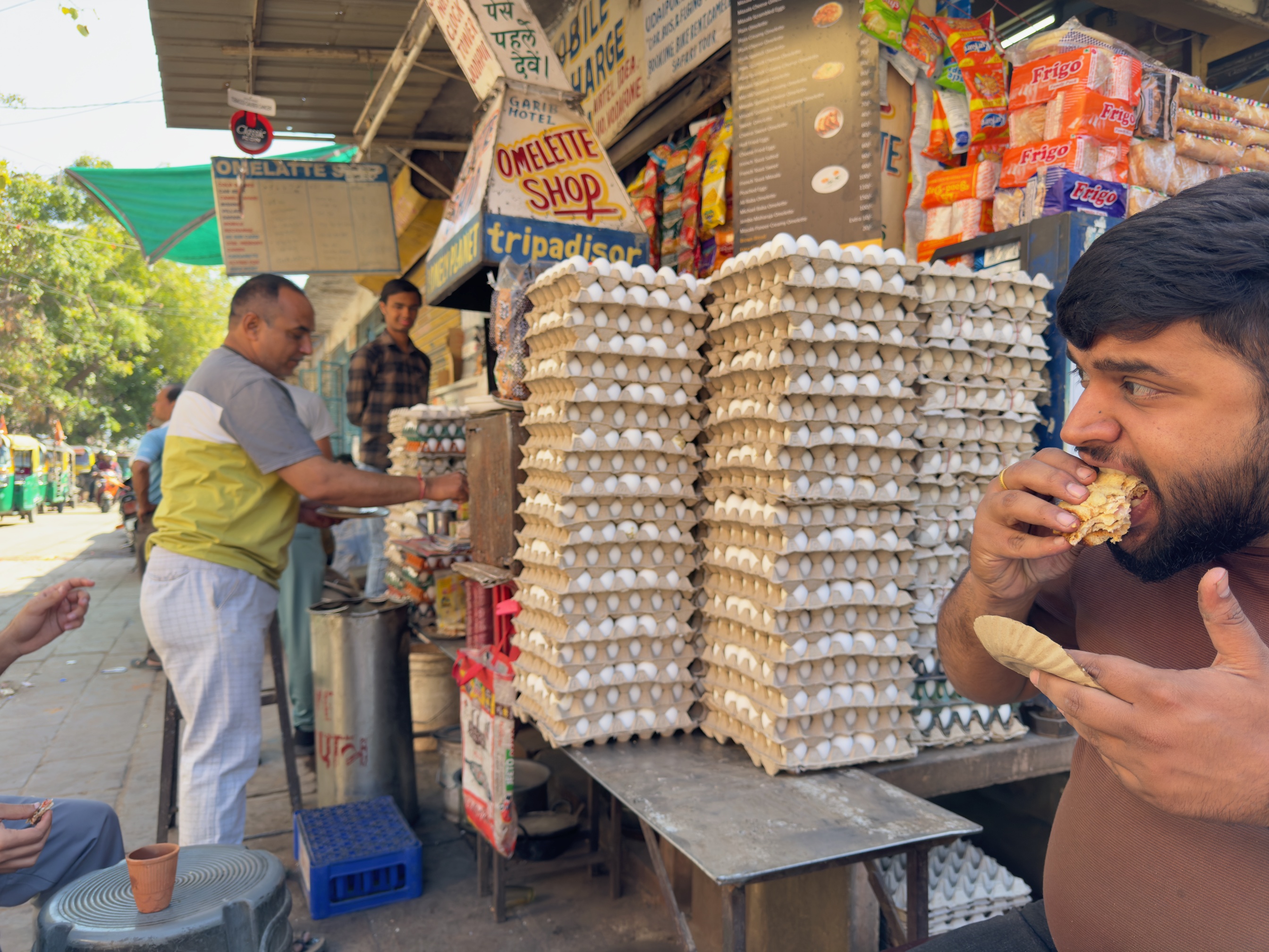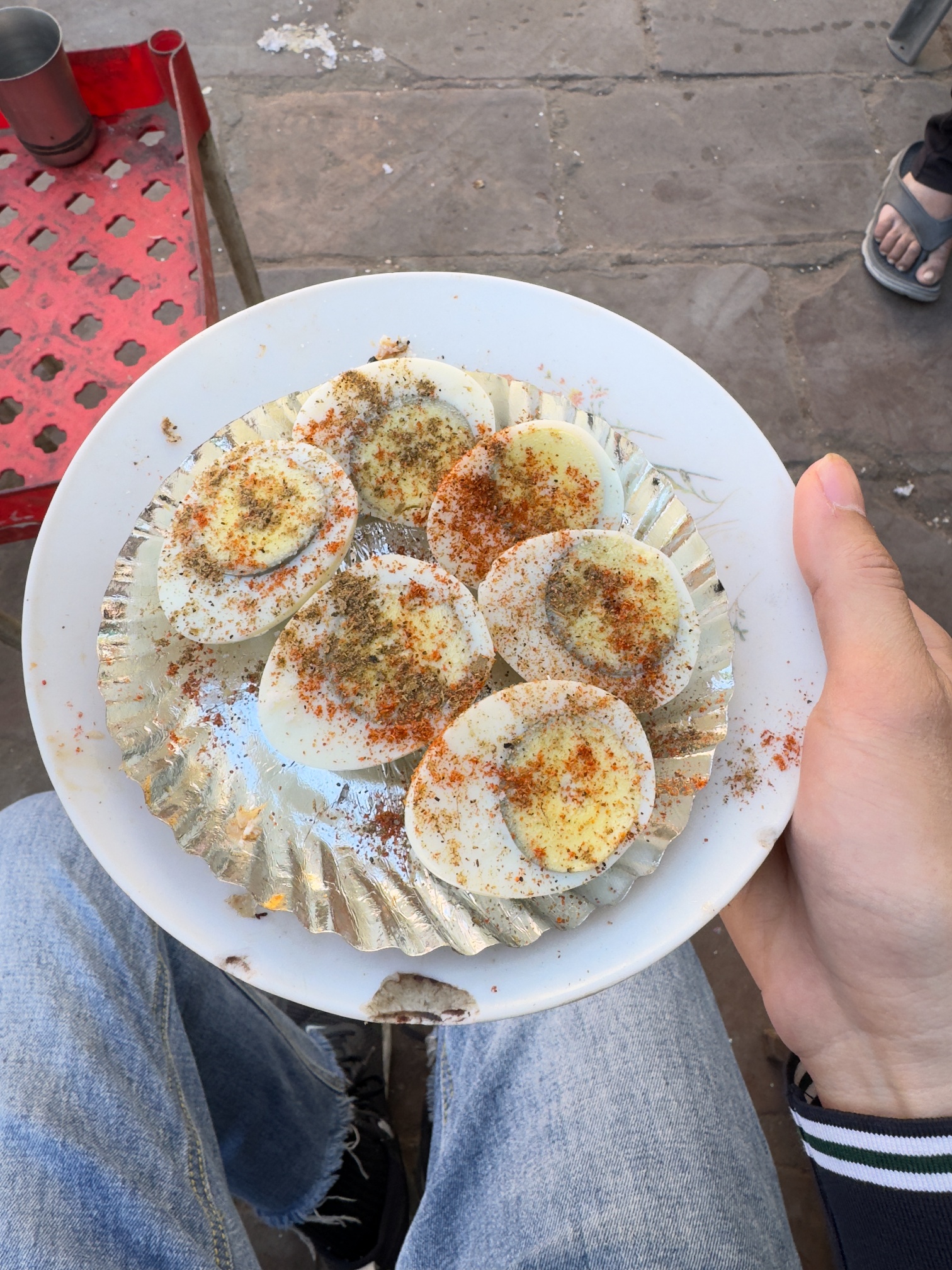 隔天一早退宿後就又去吃歐姆蛋土司及水煮蛋,不過到的時候店舖還沒開張,剛好遇到一位來自台灣的阿姨,她是我第一個遇到的台灣人,她來過印度很多次,也很常去菩提迦耶,剛好我們下午也要坐同一班火車到賈沙梅爾,沒想到也是要下榻同一個飯店,緣份真是奇妙。