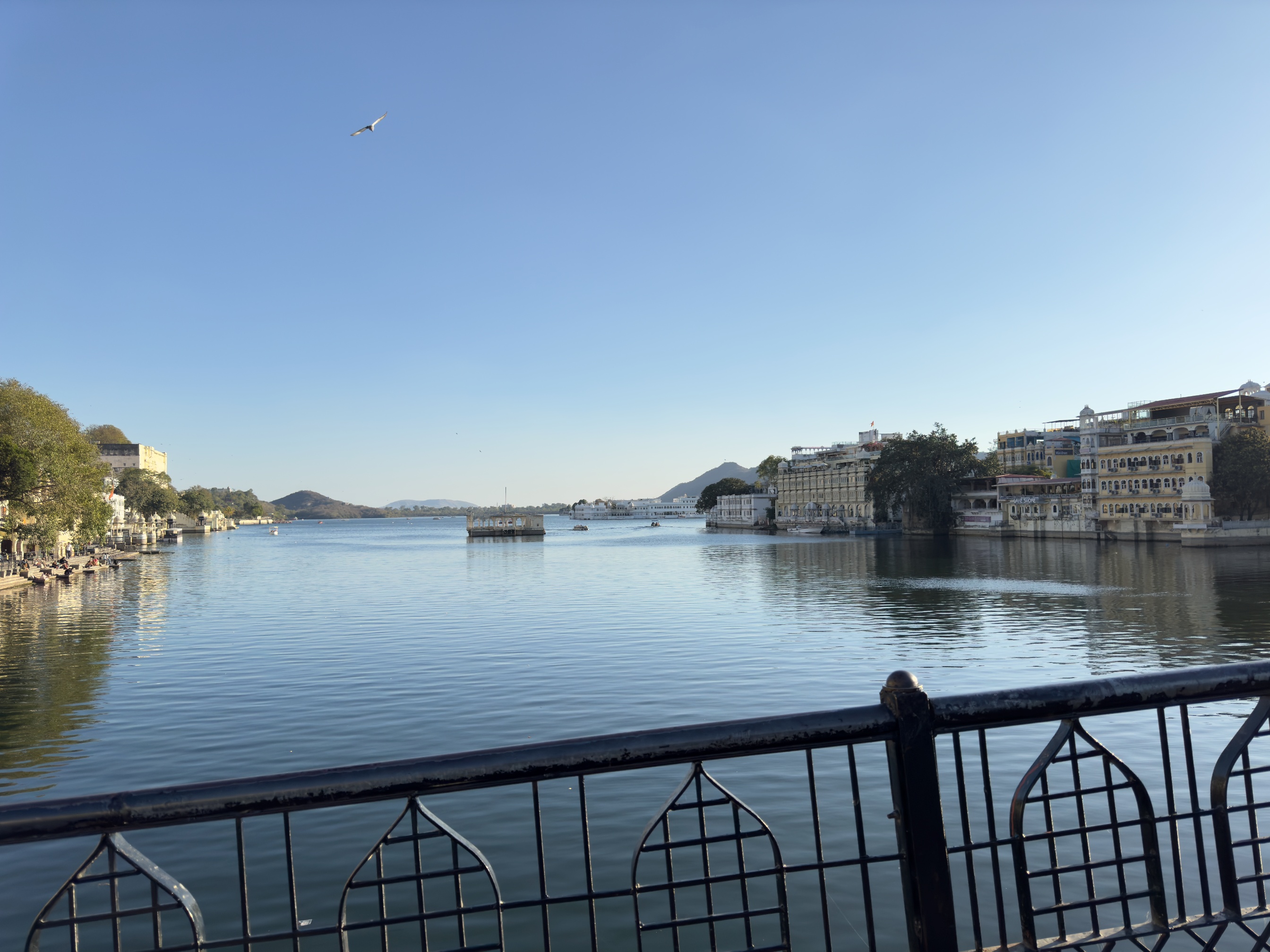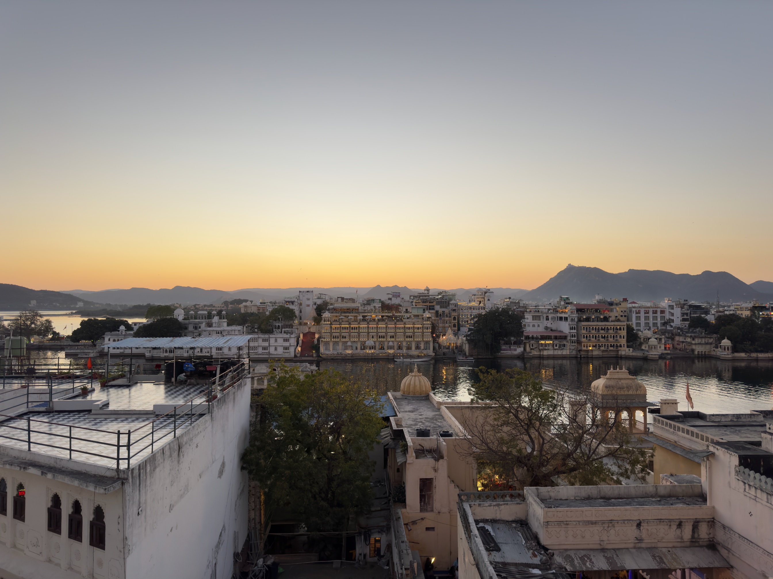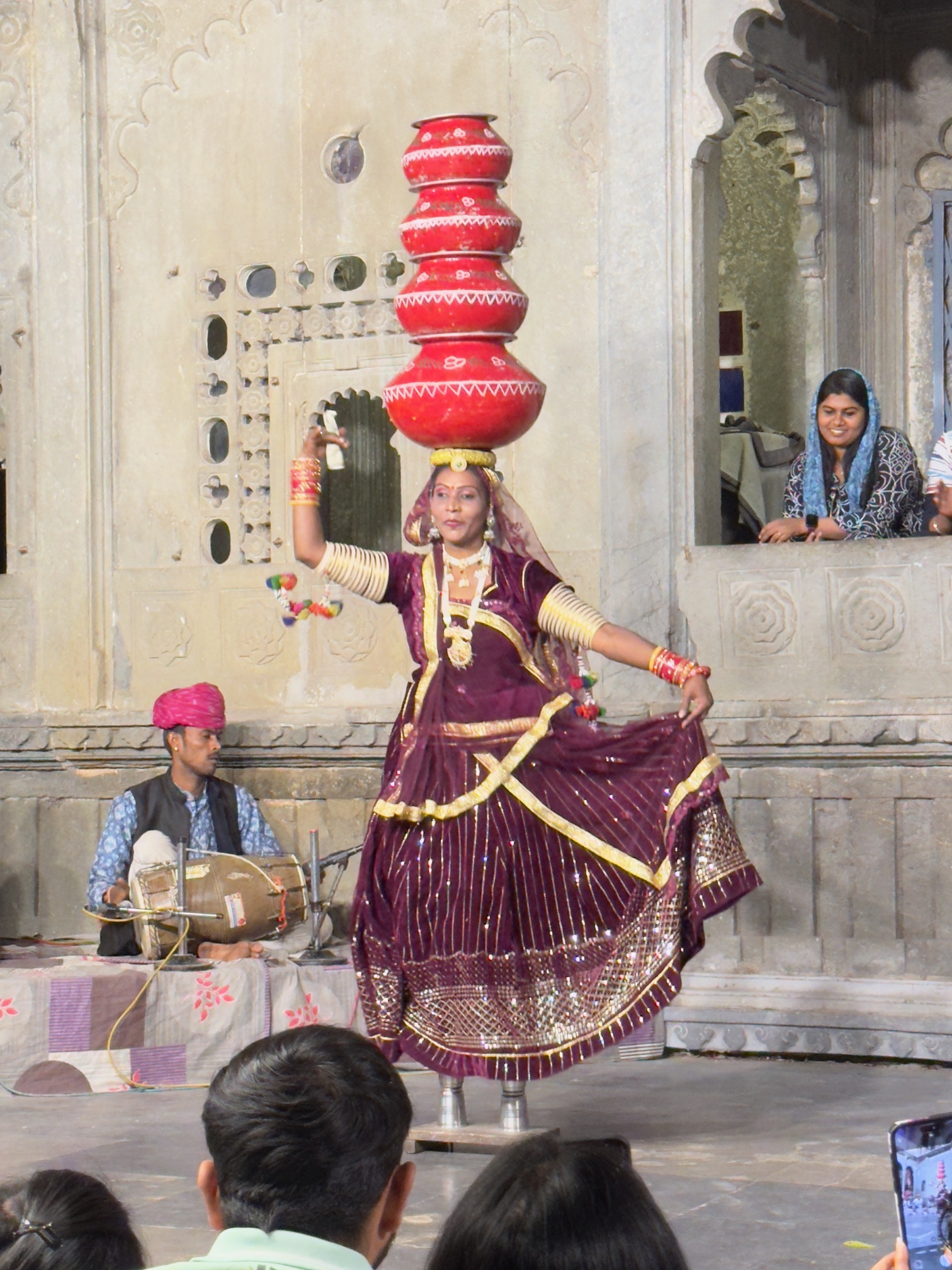 因為預訂了隔天看日出行程,本來預計六點就要從青旅出發,結果因為第一天遇到的印度女生遲到半小時,導致日出行程整個被延誤,而因為是騎摩托車過去,去程是被一個20歲的工作人員印度小哥載,最讓我驚奇的是,在上山的時候,他竟然會掏出手機開始錄影,完全不在乎後座乘客的安危,心裡就在想你可以經常看到何必再騎車的時候錄影,而且我們這台摩托車上山爬坡的時候不給力,只能緩慢怠速移動,真是讓人感到不悅,由於印度女生遲到導致出發延誤,讓我們錯過太陽從山頭出現的瞬間,等到我們到山頂時,太陽早已升起,不過撇除人和交通的問題,看日出的山頂真的很美,天空的漸層從橙紅到青藍,著實讓人著迷,而且等到太陽出現後就也不那麼寒冷,看完日出後也順路看了一些景點,到另一個山頭去看另一個湖(Badi Lake),恰好遇到有兩組新人在拍婚紗,平靜的湖面倒映著圍繞的山頭,這裡確實是相當的美。而這趟日出之旅並不是那麼順利,這當中也有意外發生,在我們回青旅的路上,不知道為什麼身為工作人員的印度小哥不騎最後一個押後,偏偏要一直超車跟在老闆的後面,而靠近市區的路況又相當混亂且繁雜,導致後面有一個英國嬉皮小哥騎到一半失蹤,老闆只好繞回去找他,幸好最後他有平安出現,我們這才一起回青旅,為這次的日出之旅畫下驚奇且平安的句點。而最後一天在烏代浦的晚上,我參加附近私人博物館舉辦的晚會表演,坐在我旁邊的是一個韓國年年輕小哥,一開始他還用韓文問我是不是韓國人,可能是亞洲人太少了他才這樣覺得,而晚會展示一些關於拉賈斯坦邦的一些舞蹈或是木偶表演,有些用火罐頂在頭上跳舞,有些以高難度的動作用嘴巴將地上的鈔票拾起,最後壓軸更是在頭上頂著多個罐子跳舞,整個表演相當精彩。